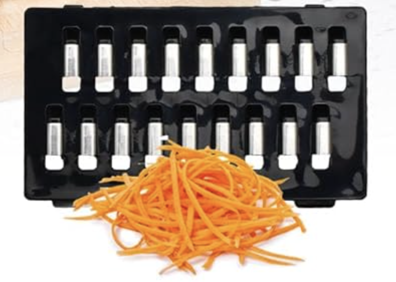 Mandolina Cook Smarter 9-în-1 este un instrument puternic și durabil folosit pentru felierea și răzuirea alimentelor. Are 8 lame versatile și este însoțită de un cuțit econom care, în plus față de tăierea normală, taie și julienne.